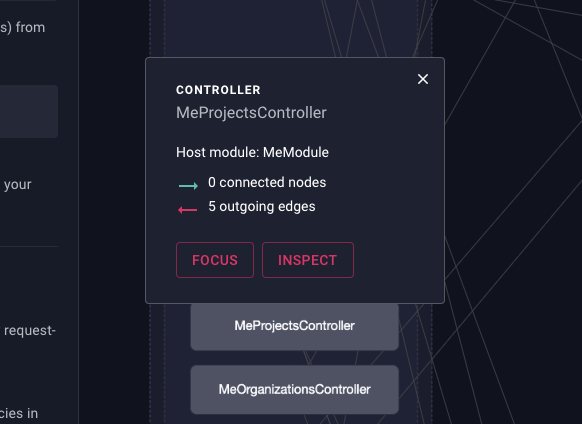 If you click on a specific entrypoint, a flow graph will be displayed. This graph shows the execution flow of the entrypoint (e.g. guards, interceptors, pipes, etc. bound to this route). This is particularly useful when you want to understand how the request/response cycle looks for a specific route, or when troubleshooting why a specific guard/interceptor/pipe is not being executed.